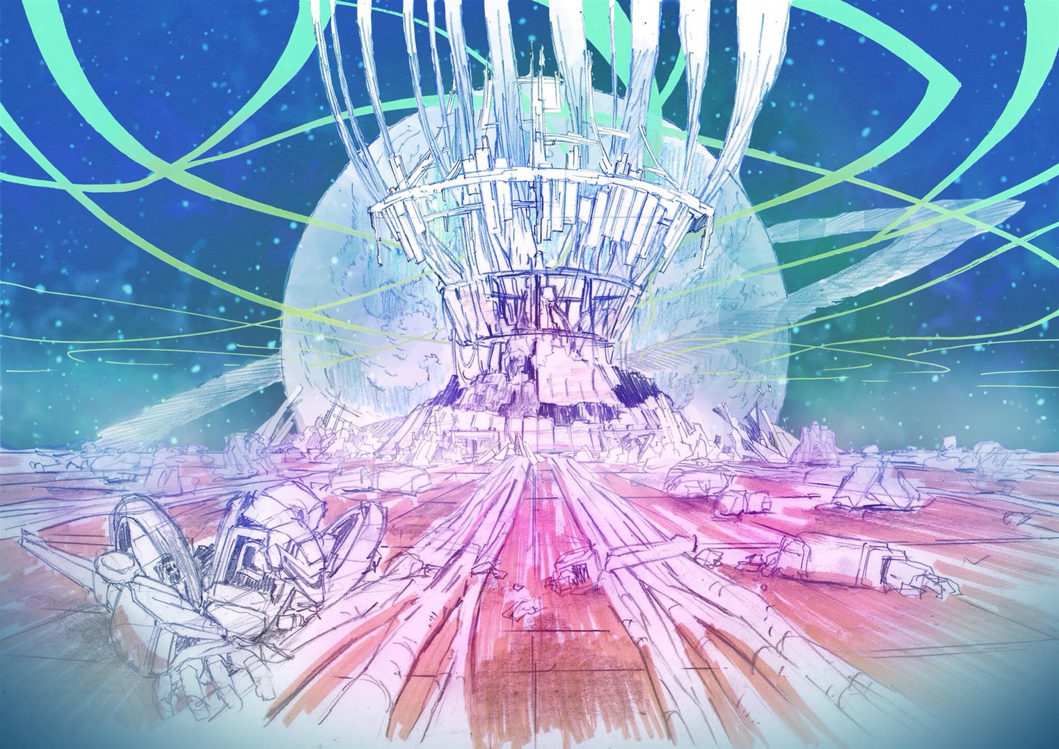 大きな建物の後ろに見える星は地球なのか?月なのか?それとも別の星なのか?